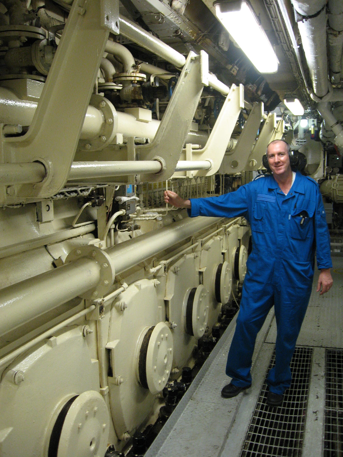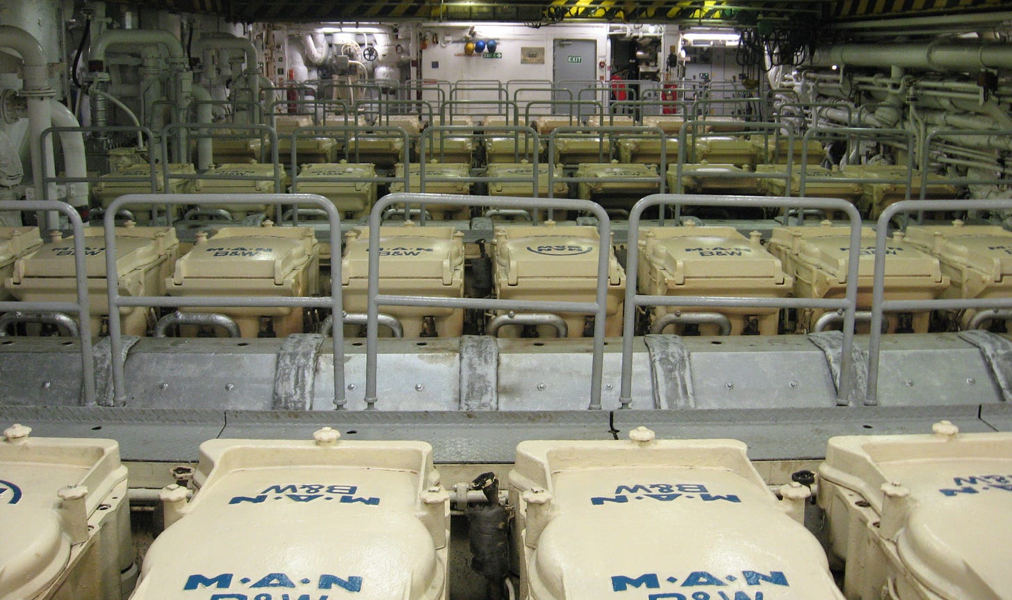 The new propulsion system was built around nine MAN B&W diesel electric engines. Each engine, a nine-cylinder supercharged behemoth, was around the size of a double-decker bus.