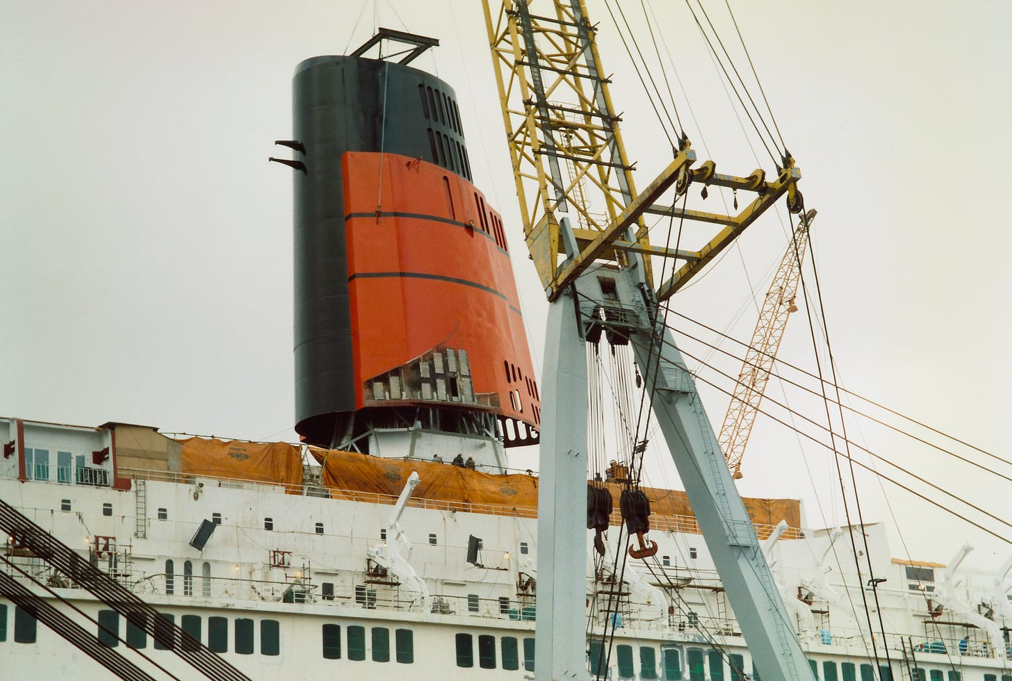 This monumental project was carried out at the Lloyd Werft shipyard in Bremerhaven, Germany. The extensive refit involved the removal of the old steam turbine plant, a process that saw over 4,700 tons of machinery scrapped. It was removed through the large central hole left in the ship when the original funnel was detached.